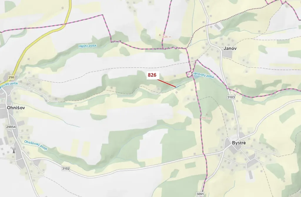 Lesní pozemek o výměře 248 m2, parcelní číslo 826, podíl 1/1, katastrální území Ohnišov, obec Ohnišov, obec s rozšířenou působností Dobruška, okres Rychnov nad Kněžnou, Královéhradecký kraj. Po těžbě.