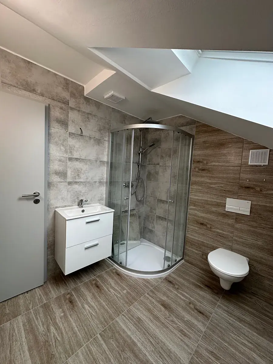 Veškeré sanitární vybavení je z kvalitních materiálů. Okna zn. Velux, dveře Porta Doors, sanita od firmy Ptáček, tepelné čerpadlo zn. Dražice. K bytu náleží sklepní prostor.