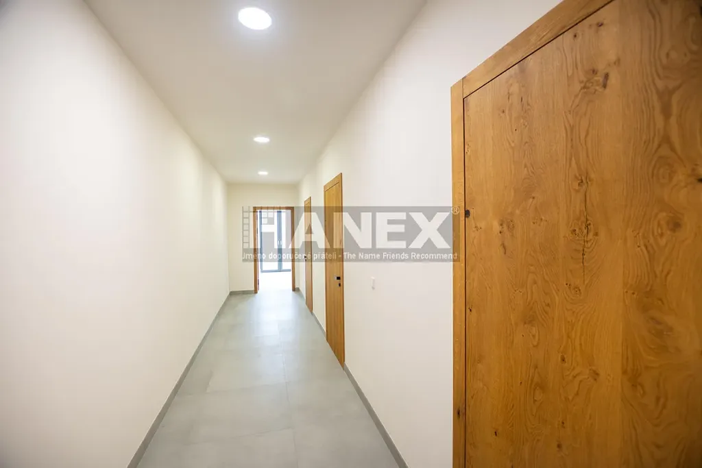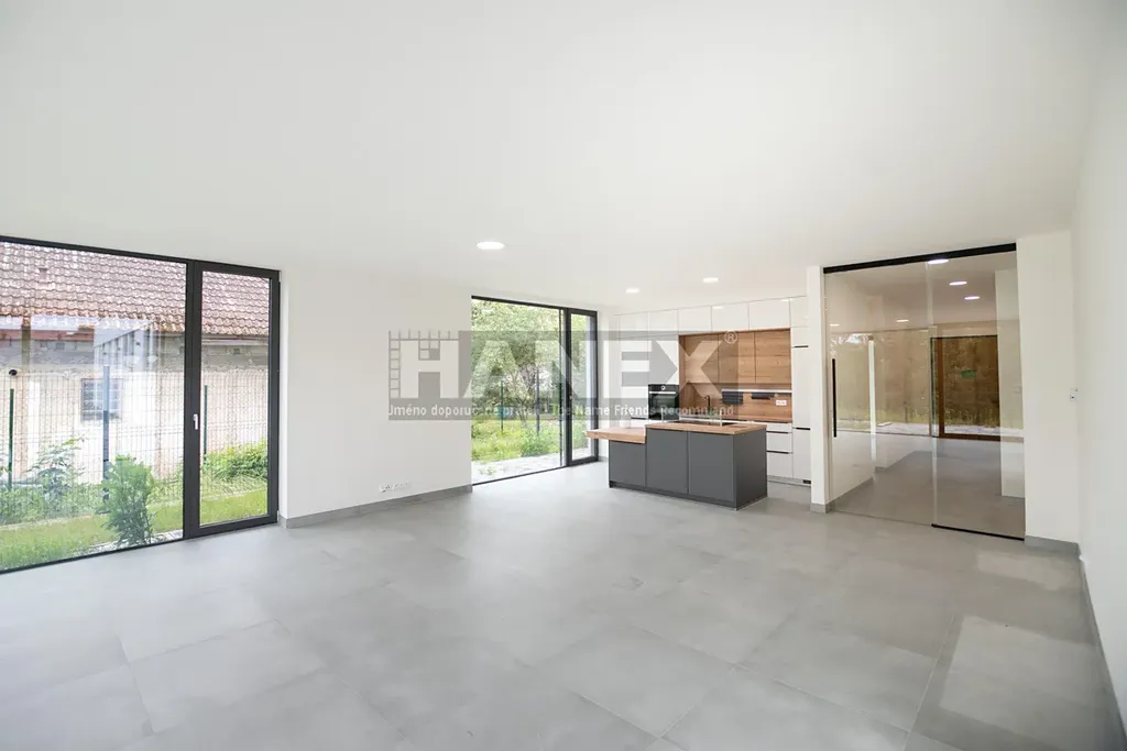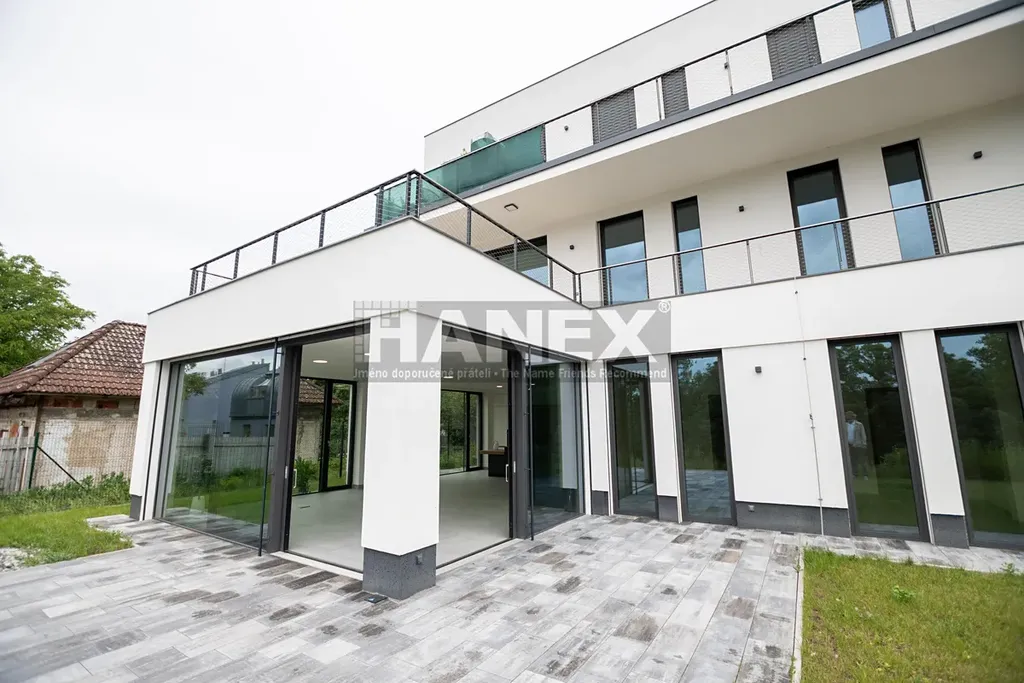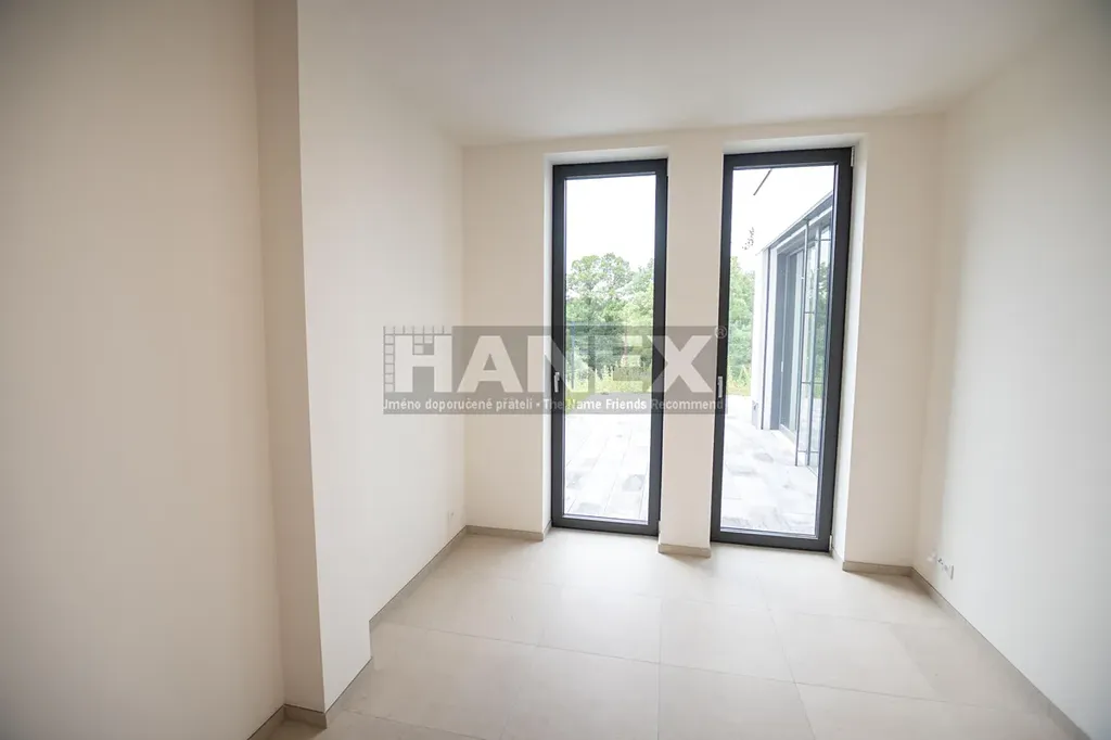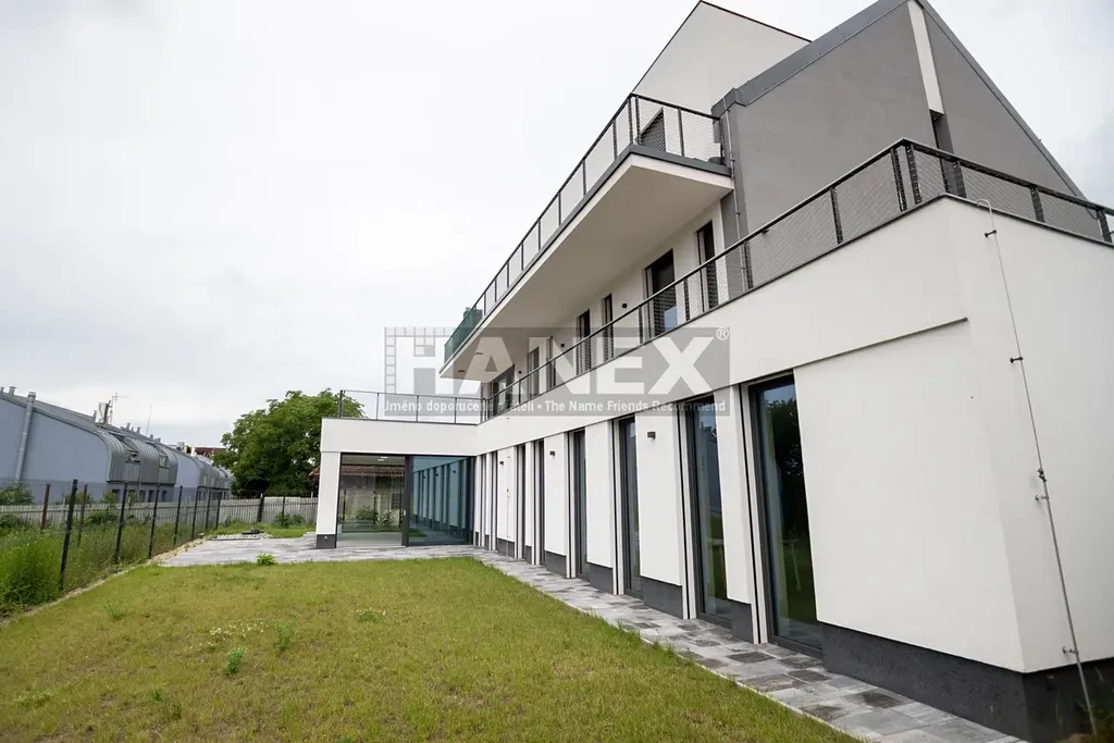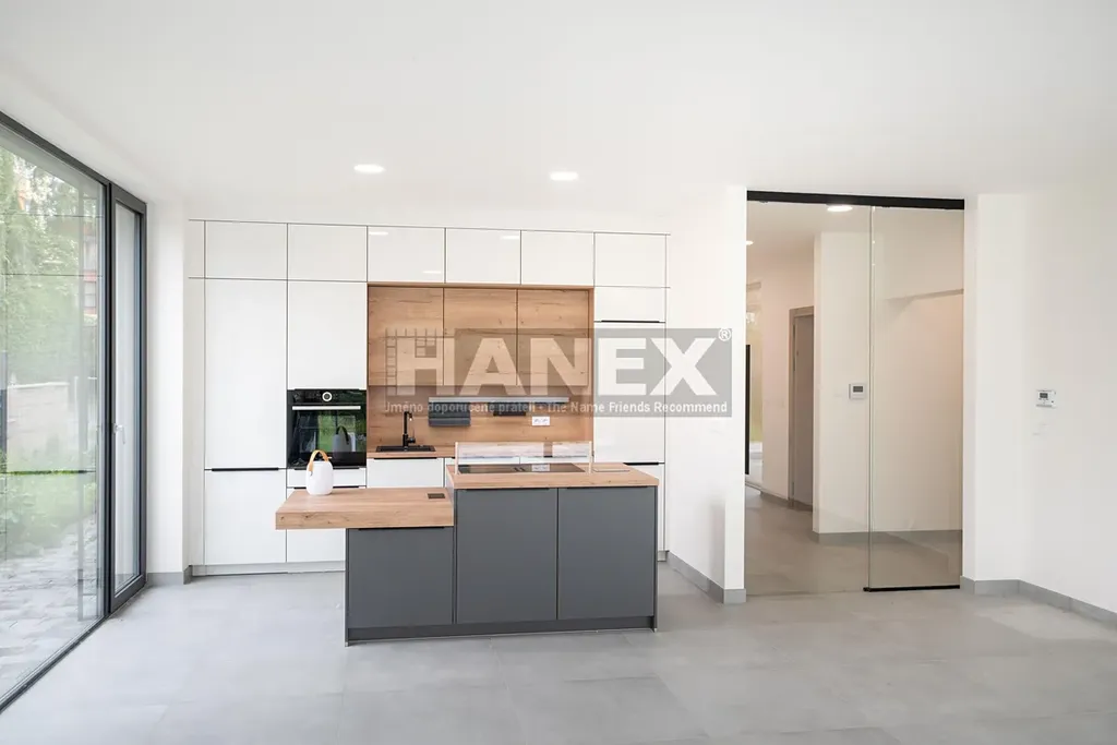 Přehlednou dispozici bytu tvoří obývací pokoj s kuchyňským koutem, komorou, třemi ložnicemi a pracovnou. K bytu patří rozhlehlá zahrada s terasou a dvě krytá parkovací stání v garáži s přípravou pro dobíjení elektromobilu.