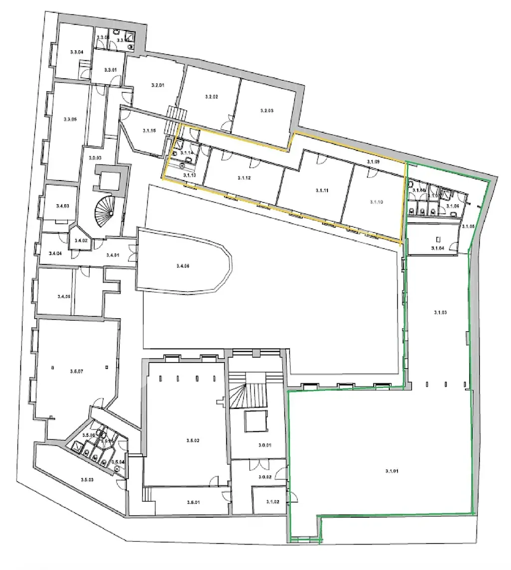 Nabízíme k pronájmu podkrovní kancelář s klimatizací o velikosti 131 m2 ve 3.patře (na plánku označena žlutě):