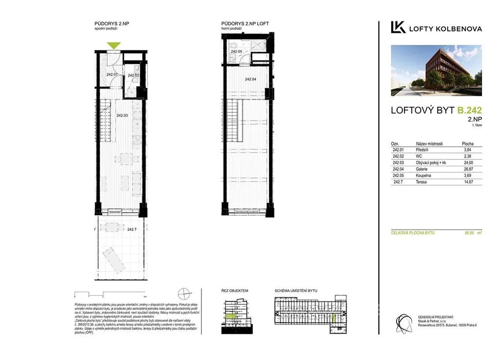 Nabízíme k prodeji loftový byt B242 kategorie 3+kk o celkové výměře 66,68 m2. K bytu náleží terasa o velikosti 14,41 m2. Byt je vybaven rekuperací, klimatizační jednotkou, podlahovým topením a předokenními žaluziemi.Objekt bývalé továrny umožňuje vestavbu funkčně praktických dispozic, a to většinou v podobě loftových bytů, přičemž v jedné části jsou podlaží plnohodnotná, v další části se jedná o vestavby spacích pater. Každý z bytů bude doplněn balkonem, zahrádkou či dokonce střešní terasou. V těchto loftech si můžete splnit svůj sen o unikátním bydlení. Vysoké industriální stropy a velká okna s ohromujícím výhledem ve vás vyvolají pocit výjimečnosti. Skvělá dopravní dostupnost a blízkost centru hlavního města činí tyto byty ještě atraktivnějšími. Za 10 minut se můžete ocitnout ve víru velkoměsta. Lofty a byty budou k nastěhování v 2Q/2025. Fotky jsou použity ze vzorového bytu jako ilustrační, nábytek, dekorace a osvětlení nejsou v ceně bytu.
