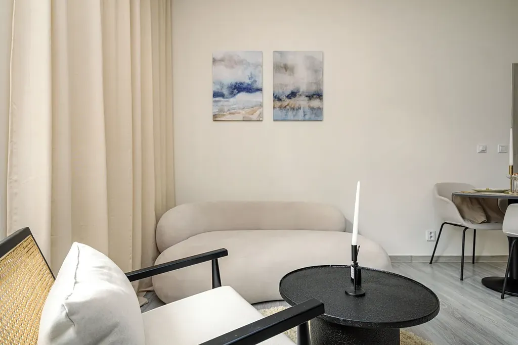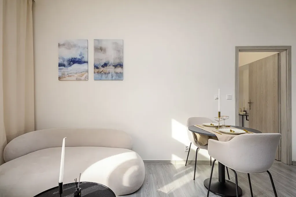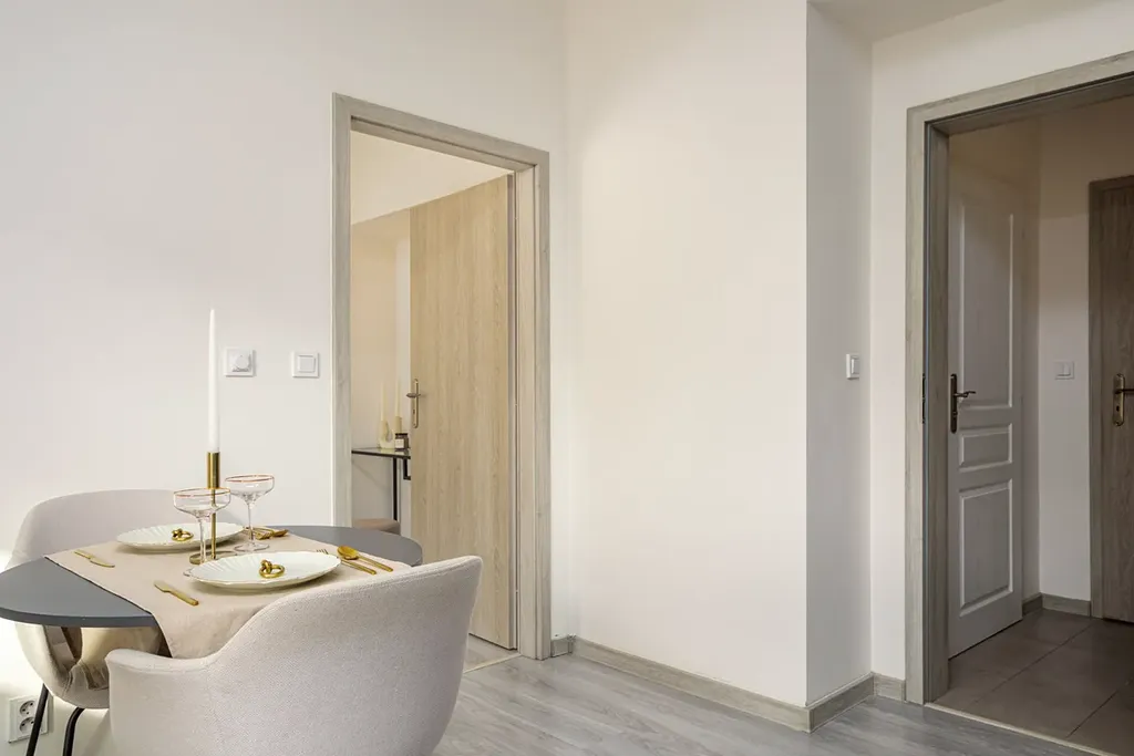 Po vstupu do bytu Vás přivítá prostorná chodba, ze které je vstup do koupelny se sprchovým koutem, toaletou a pračkou se sušičkou. Následuje obývací prostor s kuchyňským koutem, kde je moderní kuchyňská linka vybavená všemi spotřebiči, lednicí s mrazákem, myčkou, troubou, indukční varnou deskou a dalším vybavením.