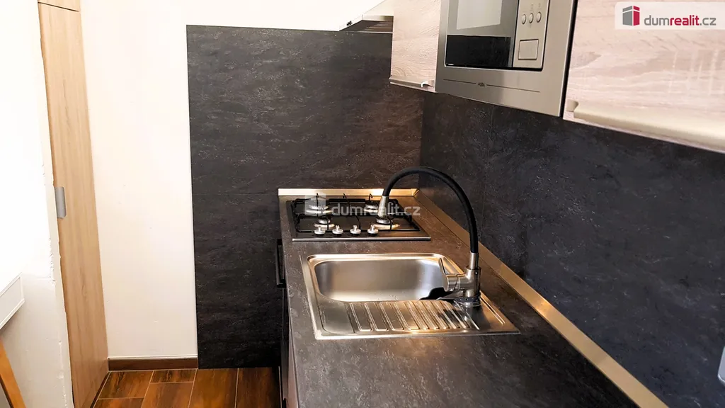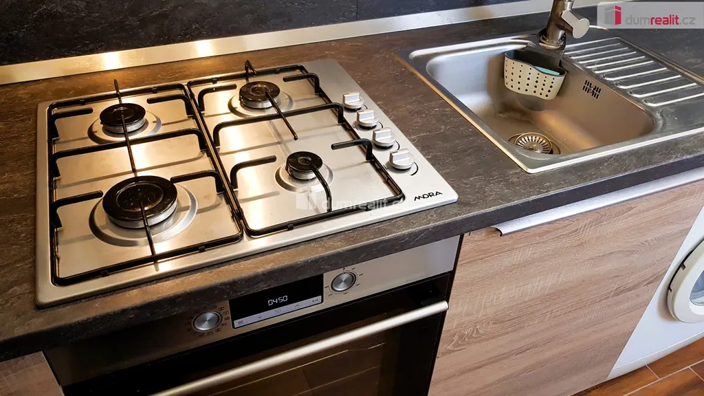 Za koupelnou a toaletou je zcela nová kuchyně. V kuchyňské lince jsou zabudované spotřebiče:
