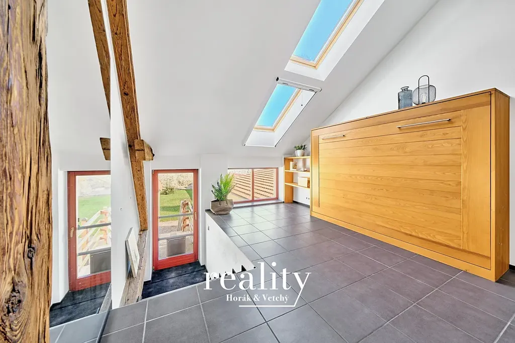 Nadčasové bydlení v patře. V prvním patře najdete prostornou bytovou jednotku s důmyslným uspořádáním. Hlavní obytný prostor spojuje moderní kuchyňský kout s ostrůvkem a obývací část s krbovými kamny. Nad kuchyňskou částí je vytvořen úložný prostor nebo útulné místo na spaní. Ložnice s vestavěnými skříněmi nabízí přímý vstup na zahradu, která se stane vaší oázou klidu.