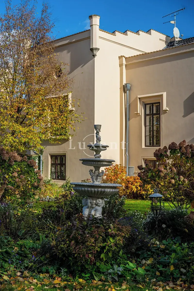 Srdcem této výjimečné rezidence o užitné ploše 1 585 m² je noblesní hlavní sál s krbem, který vytváří hřejivou a zároveň majestátní atmosféru – ideální pro rodinná i společenská setkání. Ze sálu je přímý vstup na terasu plynule navazující na rozlehlou zámeckou zahradu (4 253 m²) s jezírkem (1 536 m²), altánem a fontánou.
