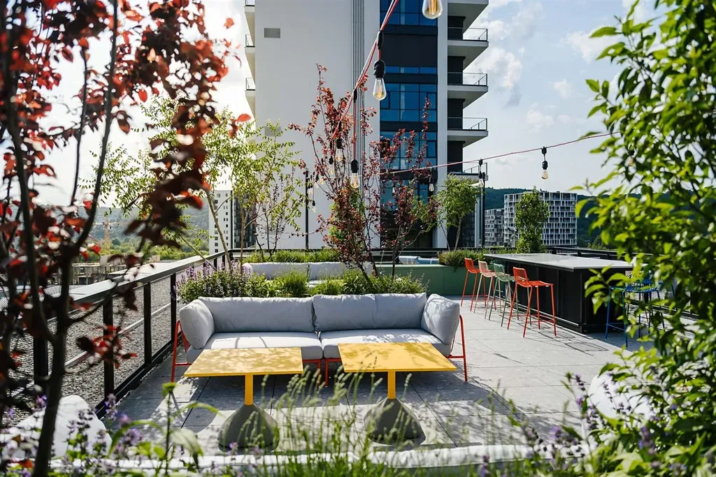 - Projekt má také střešní terasu přístupnou všem obyvatelům