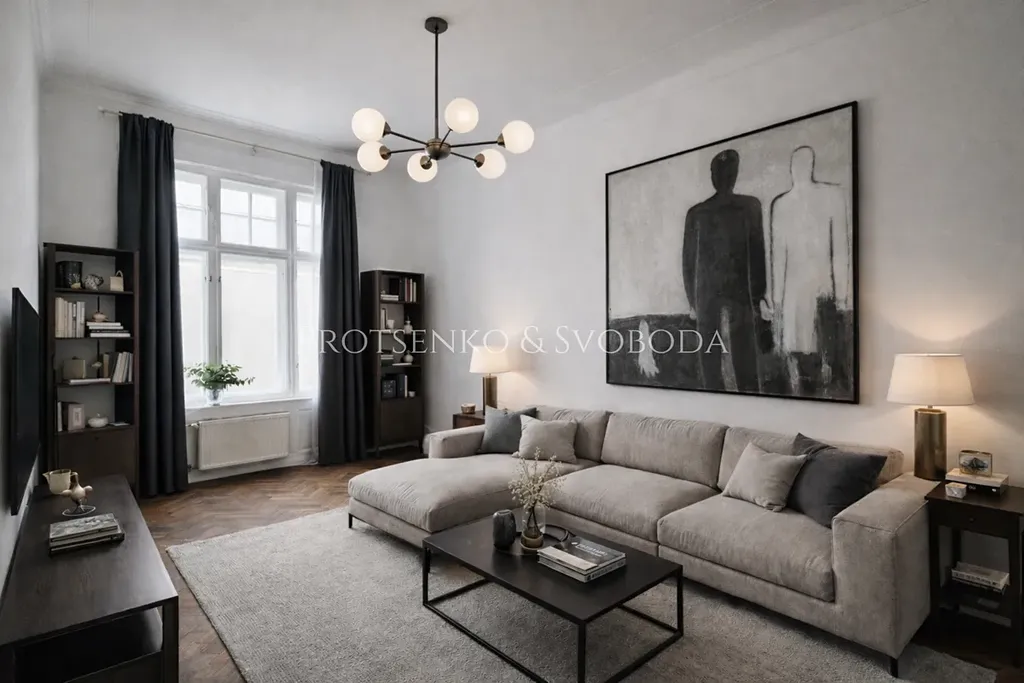 Tento byt prošel kompletní a nákladnou rekonstrukcí. Vše je zcela nové – od moderní kuchyňské linky se spotřebiči až po precizně obroušené původní parkety, které interiéru dodávají noblesu a charakter.