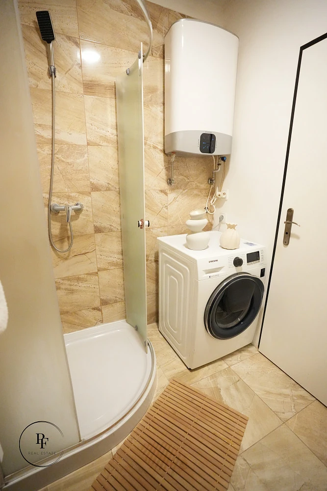 Dominantou bytu je kuchyň na míru, kompletně vybavená a navržená tak, aby nabízela maximum úložného prostoru i pohodlí při vaření.