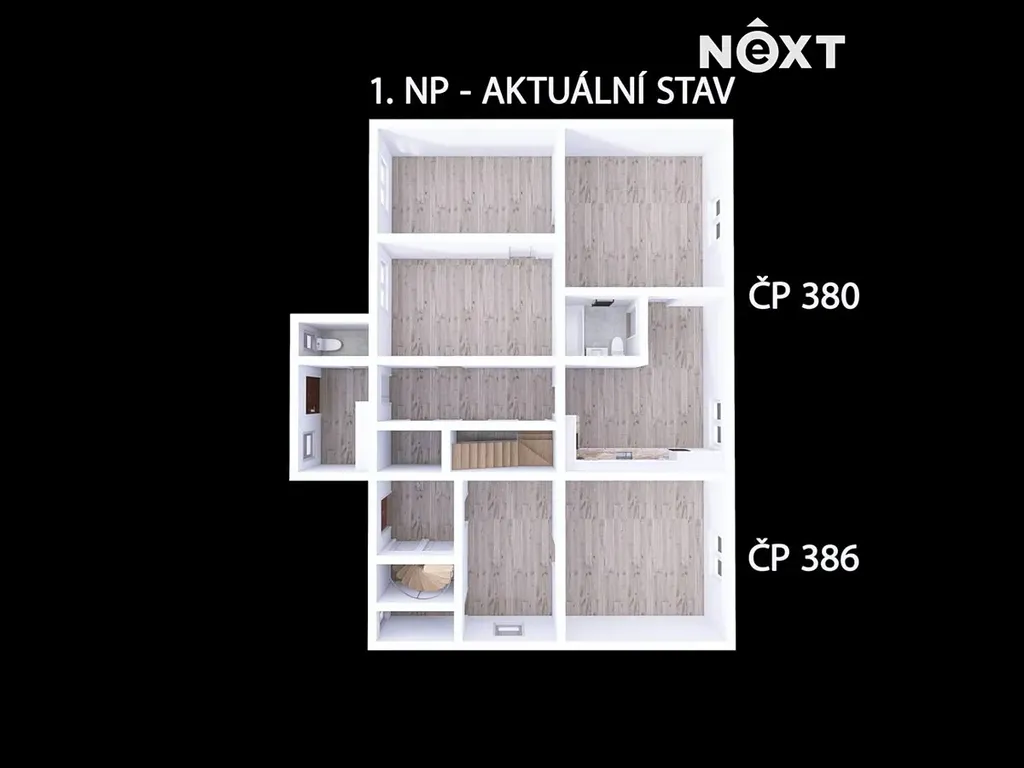 K domu byla zpracována studie na přestavbu ke krátkodobému pronájmu, a pokud byste chtěli celý projekt realizovat, tak jej zpracovatel studie dotáhne i ke zdárnému stavebnímu povolení.