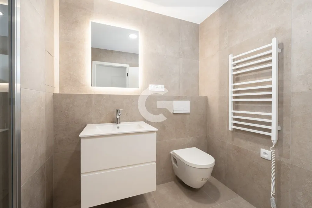 Jednotka prošla vkusnou rekonstrukcí – nové podlahy, moderní kuchyňská linka na míru včetně vestavných spotřebičů, zděné jádro, nové rozvody elektřiny a vody, plastová okna. Koupelna disponuje sprchovým koutem, toaletou a prostorem pro pračku.