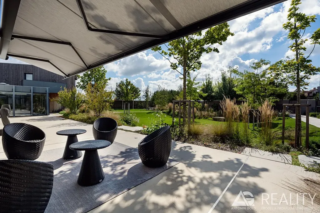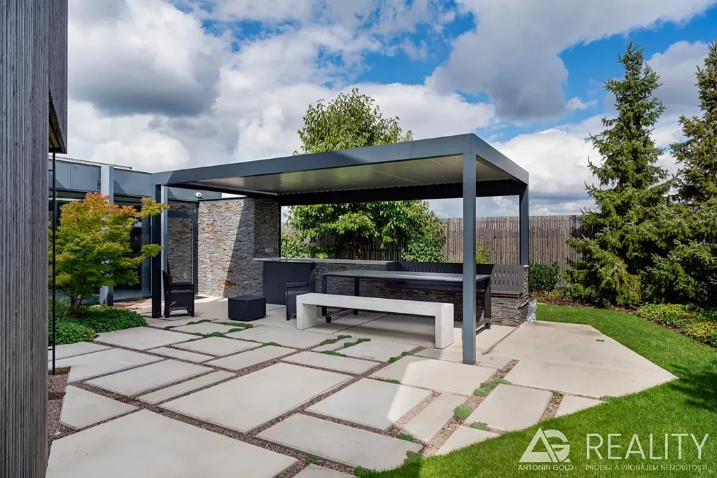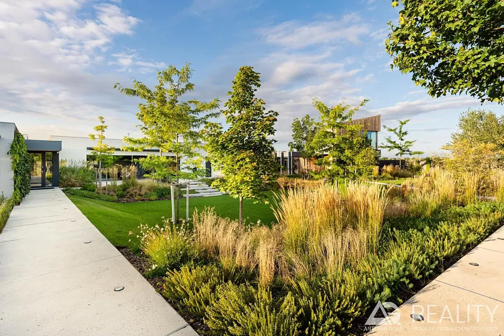 Součástí komplexu je také prostorná dvougaráž a zastřešené parkování pro další vozy, které podtrhují eleganci celého projektu.