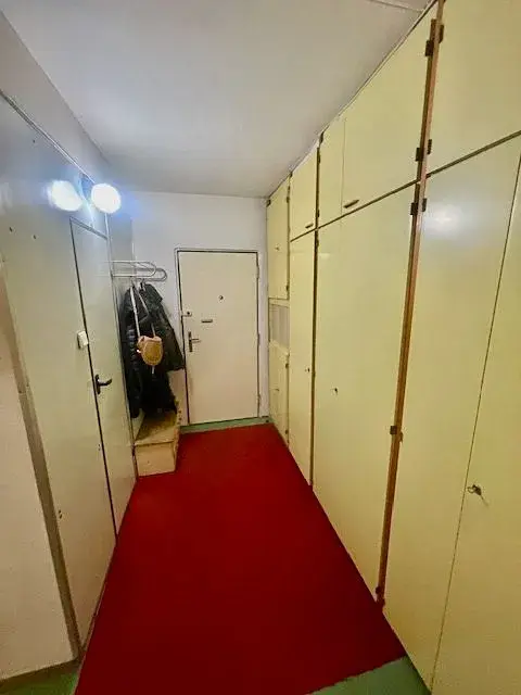 Po vstupu do bytu se ocitnete v chodbě o ploše 3,2 x 2 m ( 6,4 m2 ), z které se hned po pravé straně vstupuje do koupelny o ploše 1,6 x 1,2 m ( 1,9 m2 ) se sprchovým koutem a umývadlem, která je částečně oddělena od toalety o ploše 0,8 x 1,2 m ( 3,4 m2 ). Po celé levé straně chodby jsou umístěny původní vestavěné skříně. Proti vstupu do bytu se nachází ložnice o ploše 3,8 x 2,6 m ( 9,9 m2 ) a hned vedle po pravé straně je vstup do obývacího pokoje o ploše 4,8 x 3 m ( 14,4 m2 ) propojeného s kuchyňským koutem o ploše 2,1 x 2,2 ( 4,6 m2 ). Na podlaze všech místností, včetně koupelny a toalety je položena původní PVC podlaha. Orientace bytové jednotky je na jihozápad. V bytě je zavedena telefonní přípojka s možností instalace kabelové televize a internetu, topení je ústřední dálkové. K bytové jednotce ještě přináleží komora ( 1,2 m2 ), která se nachází na chodbě domu, hned vedle vstupu do bytu.