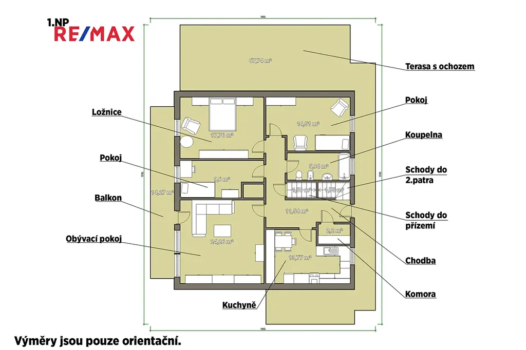 Dům je rozdělen do 3. podlaží, z nichž každé disponuje vlastní kuchyní, přičemž v 1. a 2. patře je k dispozici i samostatná koupelna a sociální zázemí včetně dalších společenských místností. 1. patro zaujme terasou o výměře 68 m2, a balkónem o 14 m2. V přízemí domu jistě oceníte 2 garáže pro bezpečné a pohodlné parkování automobilů. Pro ukládání věcí je k dispozici také půda o výměře 27 m2, nebo prostorný sklep pod domem.