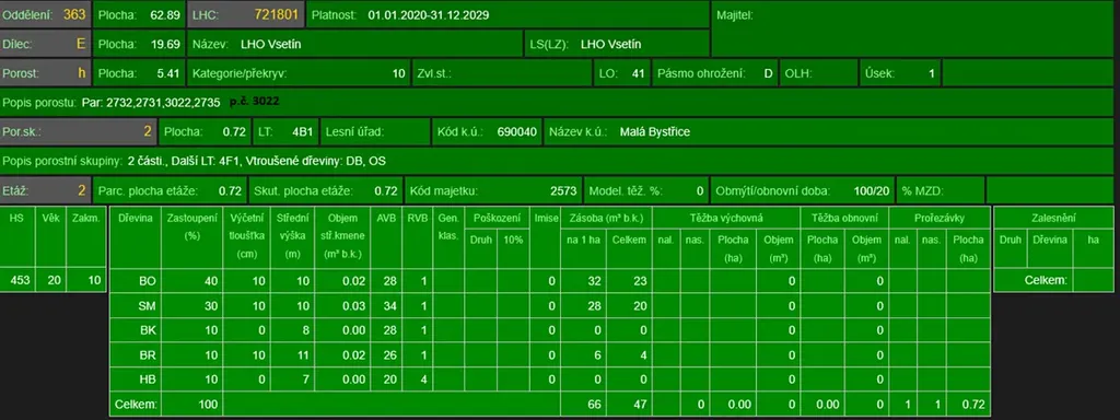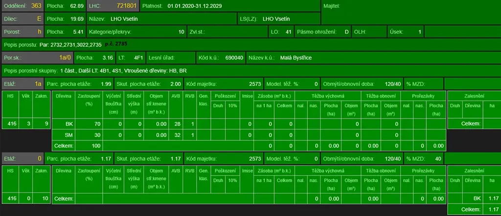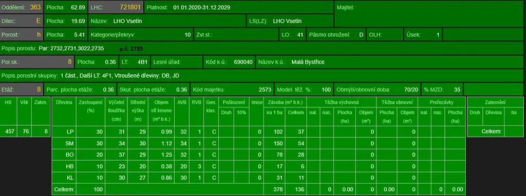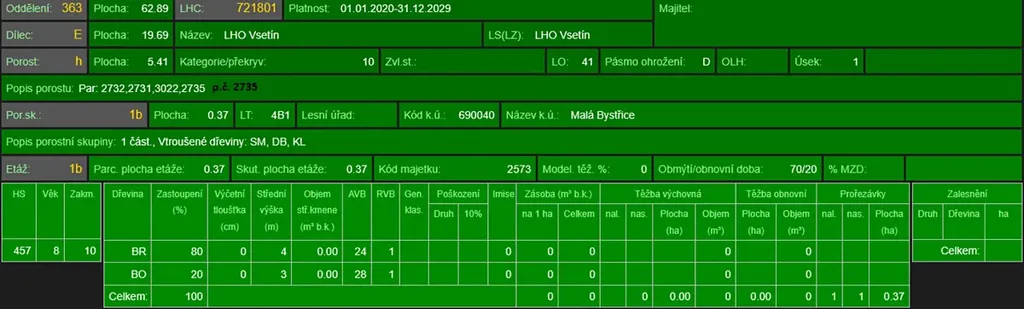 - p.č. 2735 vedená jako lesní pozemek o celkové výměře 42 830 m2 (stáří lesa 82 let - zastoupení dřevin lípa, smrk, borovice, habr, javor, stáří lesa 31 let - zastoupení dřevin lípa, habr, stáří lesa 14 let - zastoupení dřevin bříza, borovice, stáří lesa 9 let - zastoupení dřevin buk, smrk),