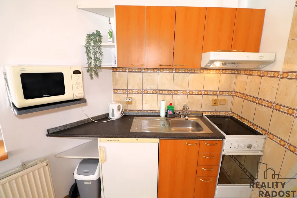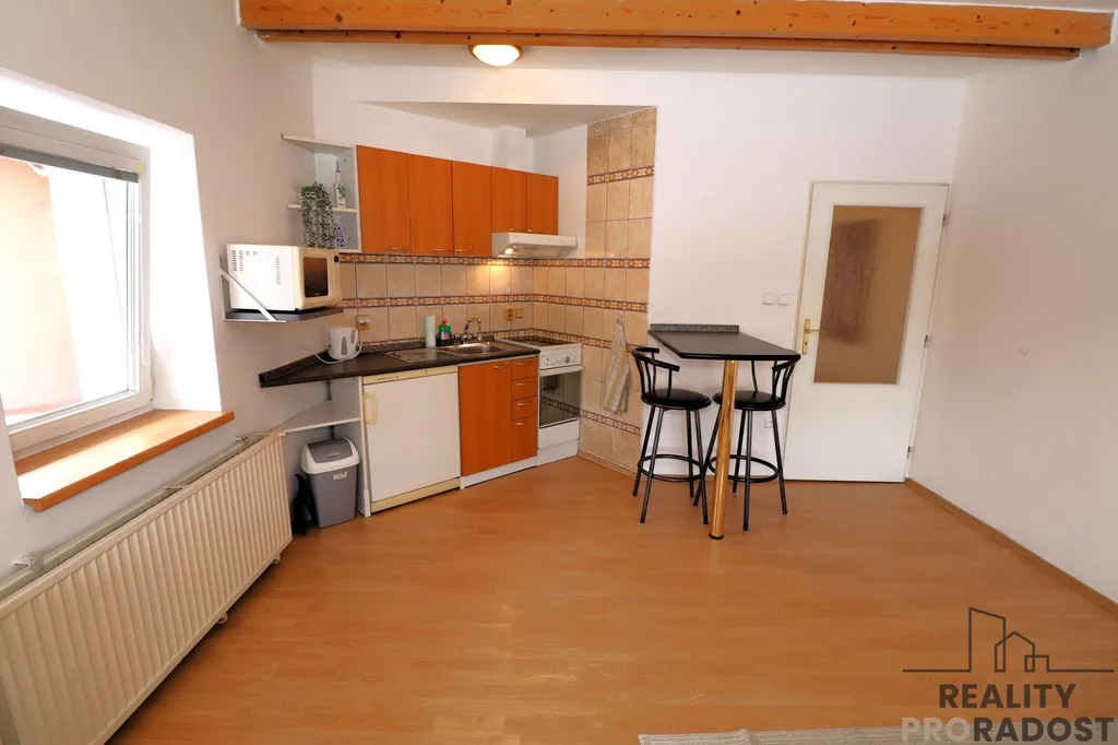 Jedná se o byt po nedávné rekonstrukci, který se nachází ve 3. podlaží udržovaného cihlového domu. Nabízí se jako kompletně zařízený a vybavený. Po vstupu do bytu se ocitnete v předsíni vybavené objemnými vestavěnými skříněmi pro pohodlné uložení věcí. Z chodby se plynule přechází do hlavního, vzdušného obývacího pokoje, jehož součástí je moderní kuchyňský kout. Kuchyňská linka disponuje štědrou pracovní plochou a je osazena kvalitními vestavěnými spotřebiči (lednice s mrazákem, elektrická trouba, indukční varná deska, myčka nádobí).