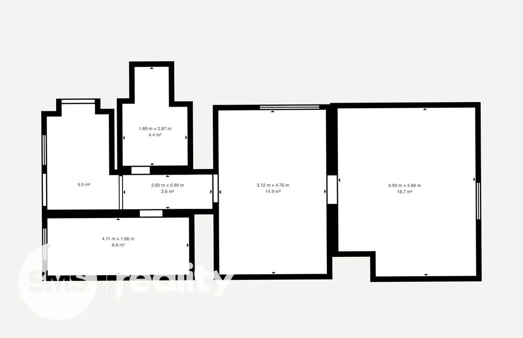 Přízemí: vstupní prostor 5,5 m² navazující na chodbu o výměře 2,6 m², technická místnost 4,4 m², koupelna 6,8 m², kuchyně 14,9 m² a obývací pokoj o velikosti 18,7 m² (součástí obývacího pokoje je schodiště do druhého patra).