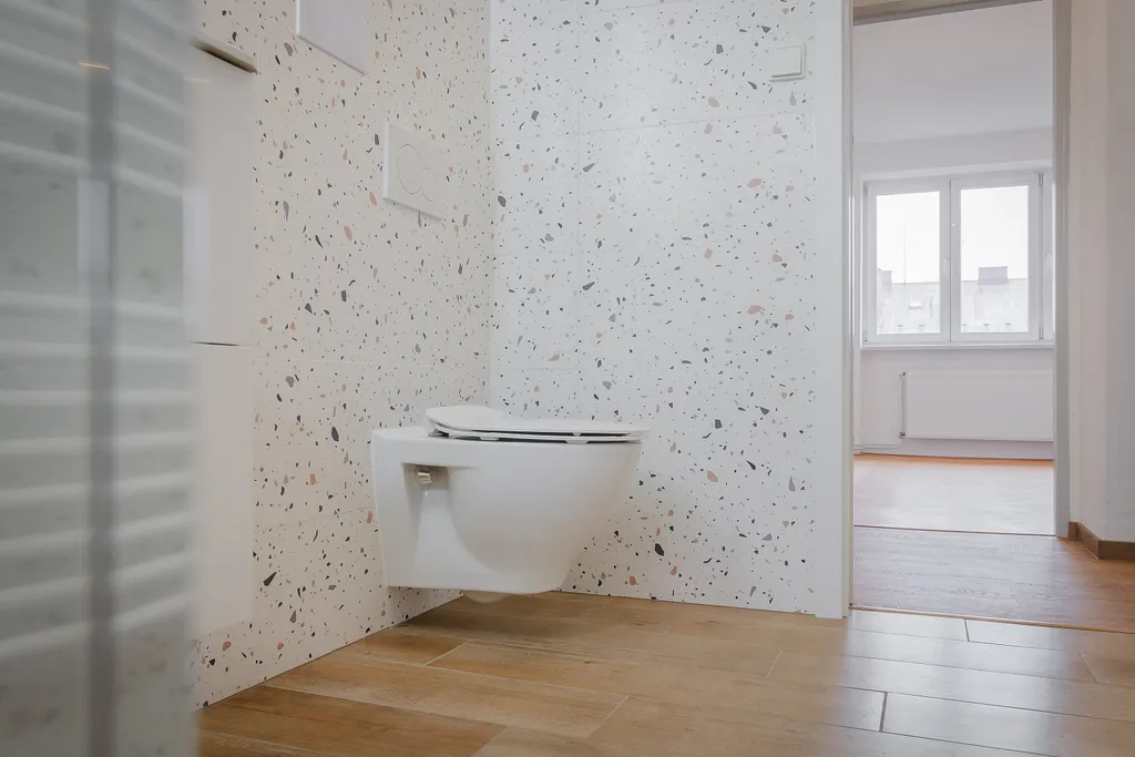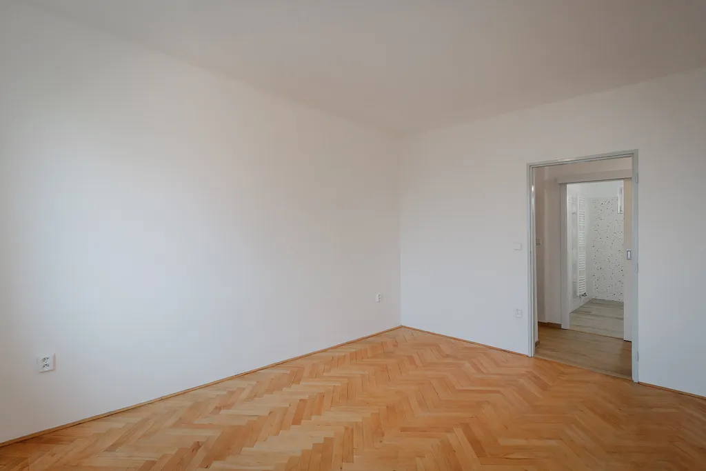 Podlaha je vinylová v části bytu a obytné pokoje dřevěné parkety, dlažba v koupelně s wc.