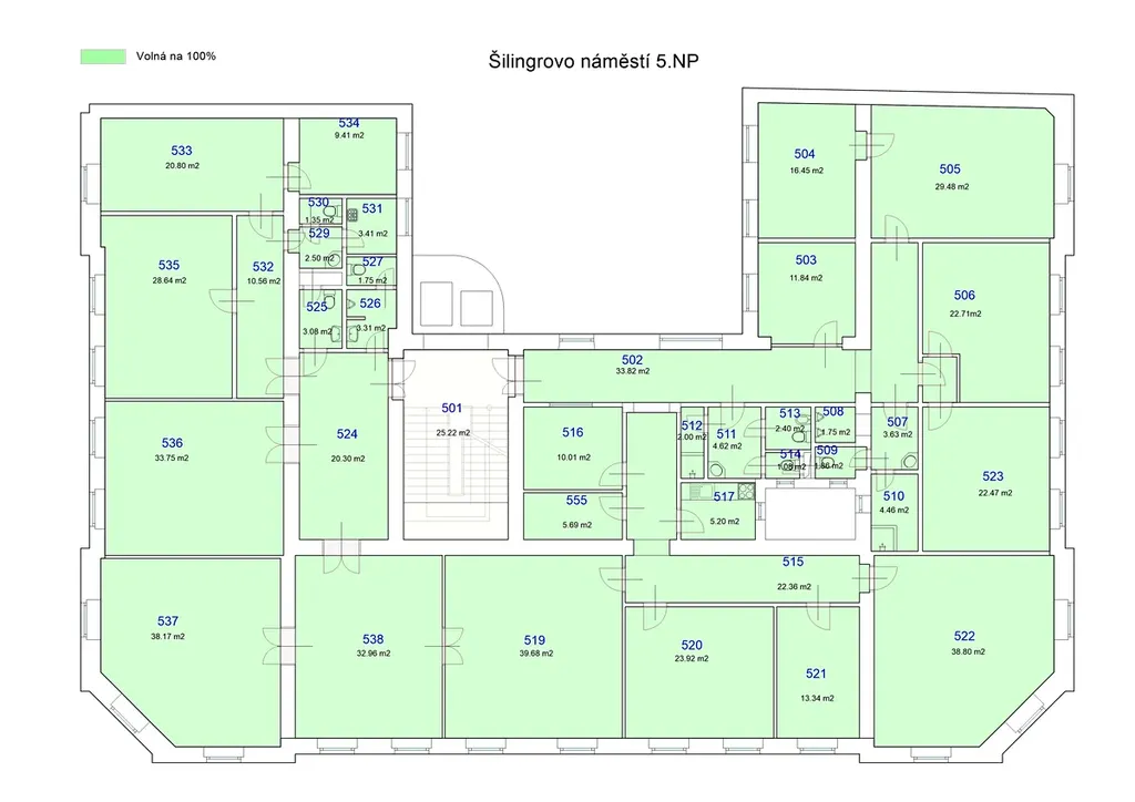 Nabízíme k pronájmu kancelář o rozloze cca 527,56 m2 v 5.NP administrativní budovy. Tato nemovitost se nachází ve velmi dobrém stavu, přímo v centru města s výbornou dostupností MHD. Tento prostor je nyní celkově propojený, ale vzhledem k tomu, že je přístupný ze dvou stran z podesty schodiště, lze ho případně i logicky rozdělit na 2 - 3 menší samostatné jednotky a pronajímat samostatně.