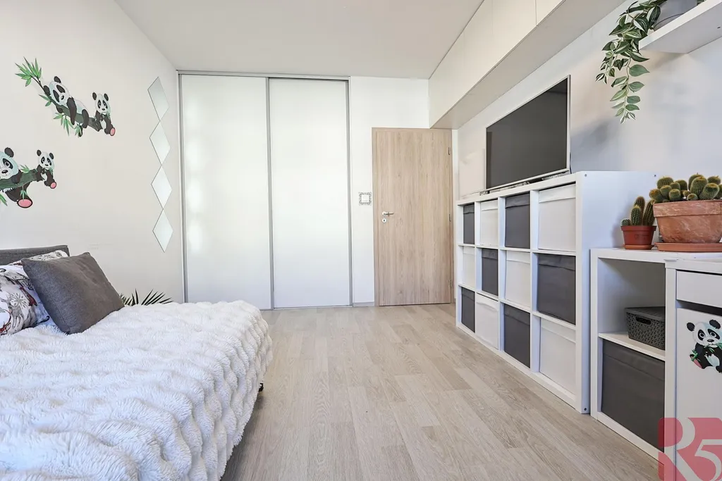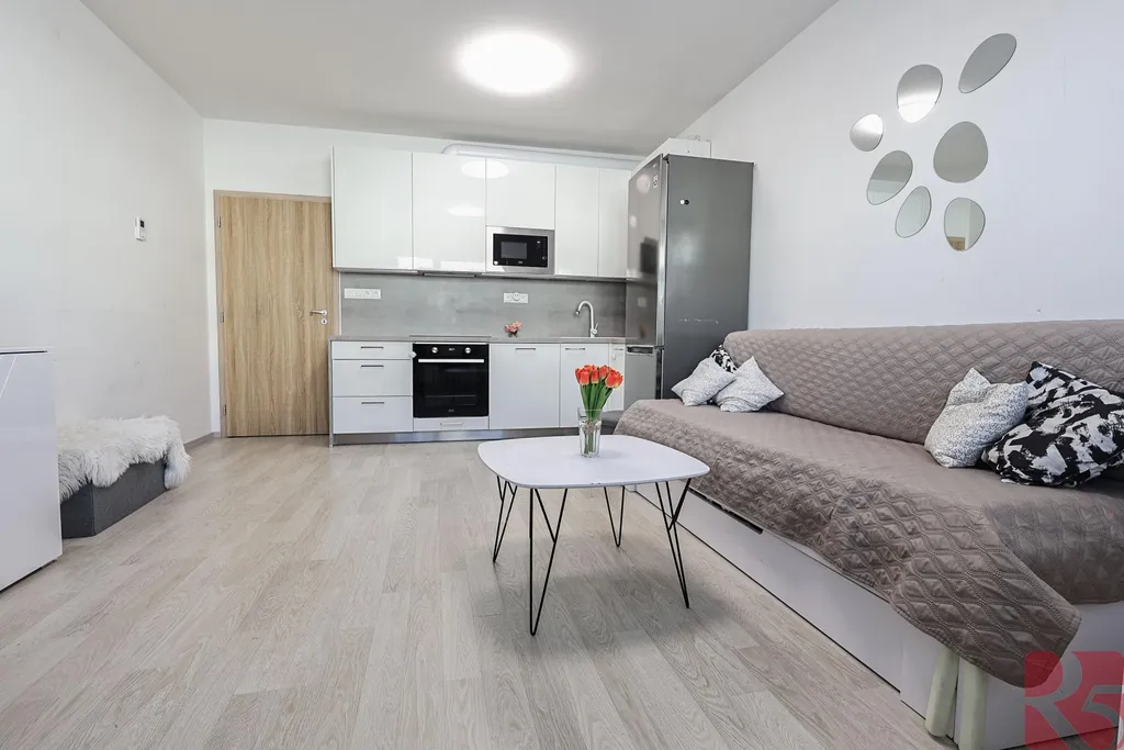 Moderní byt z roku 2021 je vybaven prostornou kuchyňskou linkou se spotřebiči, šatní skříní v chodbě a ložnici. Další úložné prostory nabízí zavěšené skříňky.