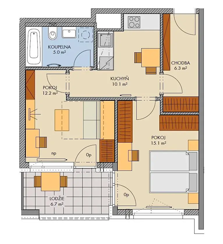 Dispozice bytu: kuchyň, pokoj, pokoj, koupelna s WC, chodba, lodžie.