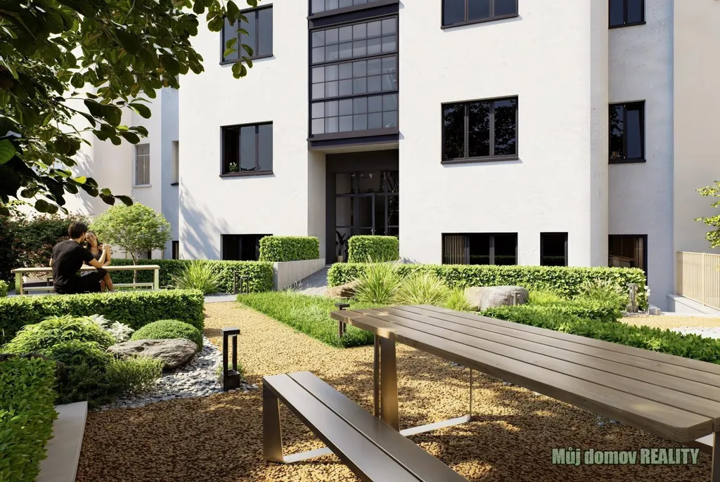 * klidný vnitřní dvůr se zelení a posezením