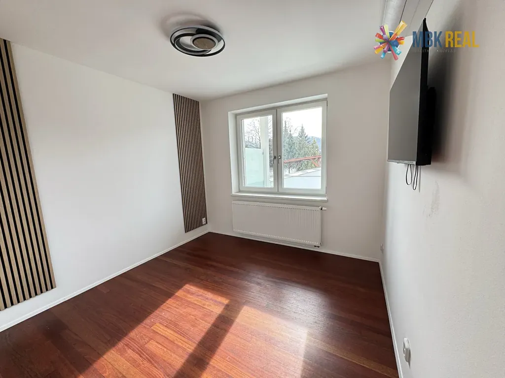 Dvě průchozí místnosti - obývací pokoj a ložnice jsou vybaveny vestavěnými skříněmi na míru a TV. Pokoje jsou situované do zahrady s výhledem do zeleně a vstupem na terasu. Součást vybavení je klimatizace a před-okenní elektricky ovládané žaluzie.