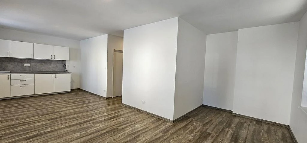 Za vstupními dveřmi bytu se nachází menší chodba, po levé straně je koupelna se sprchovým koutem, závěsnou toaletou, umyvadlem, zrcadlovou skříňkou a otopným žebříkem. Hlavní dominantou bytu je útulný obytný pokoj s kuchyňskou linkou, který vzhledem ke své velikosti lze opticky rozdělit na dvě místnosti tak jak to udělali současní nájemci. Kuchyňská linka je vybavena lednicí, dřezem a varnou dvou plotýnkou.