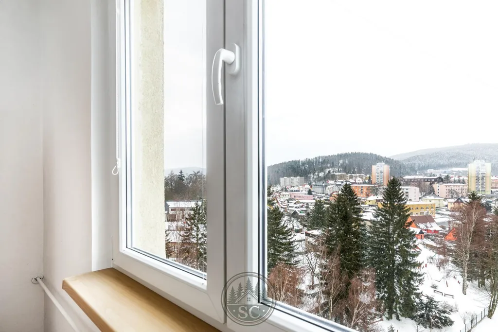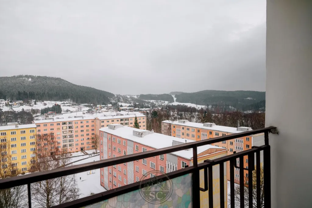 Součástí bytu je lodžie s výhledem na horskou krajinu.