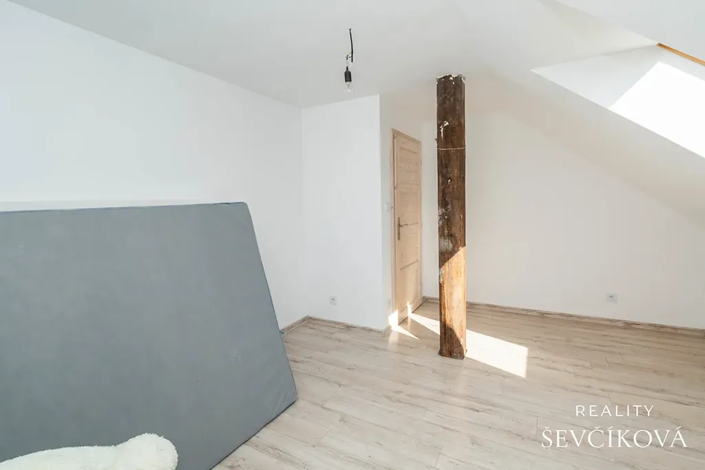 patro (90 m², část pod šikminou): tři ložnice, šatna, vstup na půdu, koupelna v přípravě
