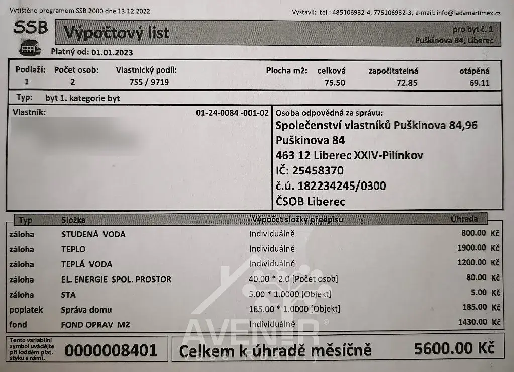 SVJ: Ostašovská 84, 96 (IČ 25458370), správce: Lada Martimex, pravidelné platby: 5600,- Kč vč. fondu oprav 1430,-, elektřina a plyn pro dva lidi činí 970,- a 380,- Kč měsíčně. Internet v domě je od LbNet, TV od Skylinku (satelit na střeše), lze samozřejmě změnit.