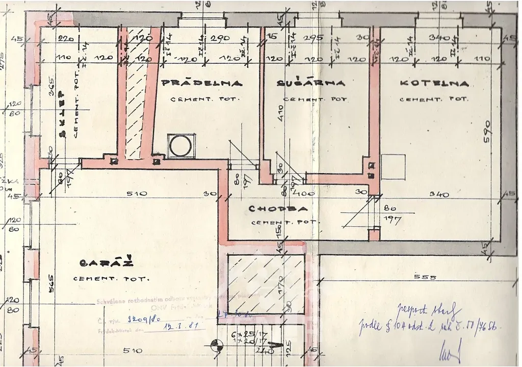 1.PP - garáž (28,8 m²), sklípek (8 m²), prádelna (10,5 m²), sušárna (12 m²), kotelna (20 m²), chodba (6 m²) a schodiště (7 m²).