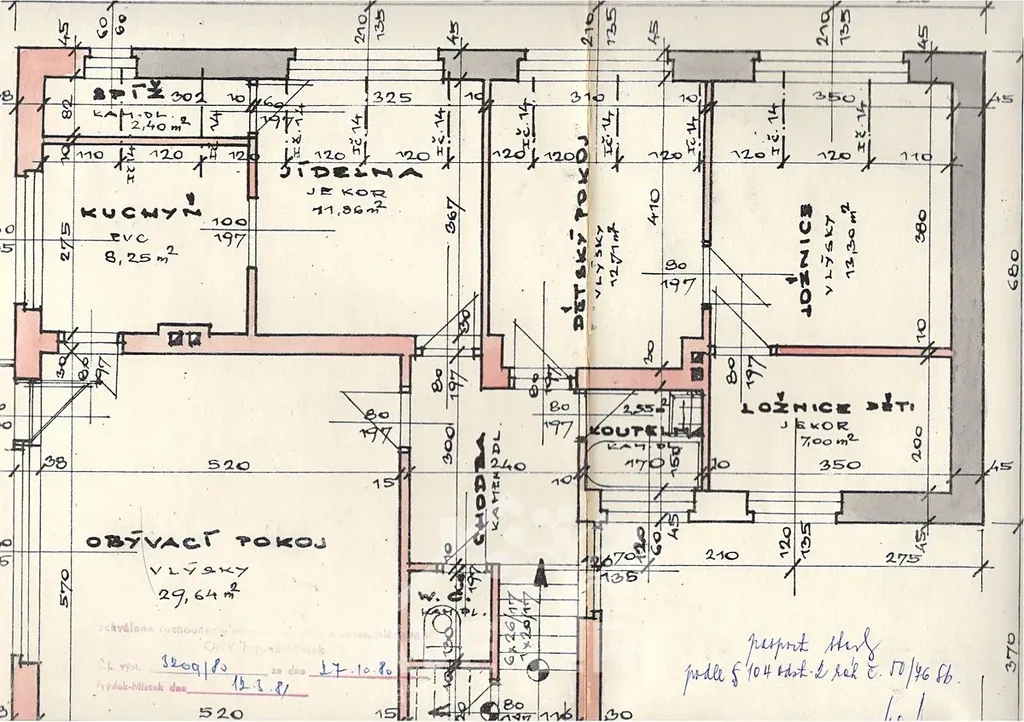 Vybavení: kuchyňská linka s plynovým sporákem, bílá špaletová okna s žaluziemi, betonové podlahy s linem a kobercem, v koupelně a WC dlažba, na domě satelit. Výška pokojů 2.7 m, výška sklepů 1.9 m.