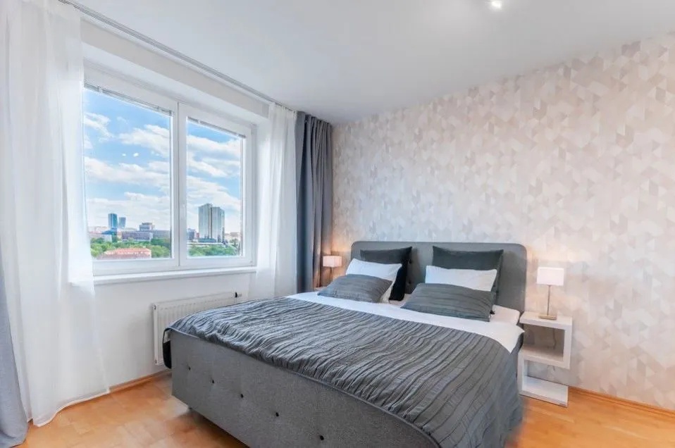 Pronájem kompletně vybaveného slunného bytu 2+kk po renovaci s parkovacím místem a sklepem, terasou letním posezením, s neopakovatelnými výhledy na panorama Prahy ve 3. nadzemním podlaží v klidné a prestižní Rezidenci Zvonařka v Praze 2 na Královských Vinohradech s recepcí, 24 hod ostrahou, vnitřním bazénem, terasou a privátním upraveným parkem ve vnitrobloku.
