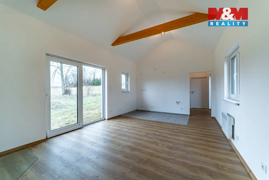Dispozice zahrnuje obývací pokoj s kuchyňským koutem, samostatnou ložnici, koupelnu s WC, zádveří a sklad. Interiér je dokončen včetně podlah, omítek a oken s izolačními skly. Vytápění je řešeno krbovými kamny a elektrickými přímotopy. Objekt je napojen na elektřinu, zdrojem vody je vlastní vrt a odpad je řešen domovní čistírnou odpadních vod. Nemovitost se nachází v ploše venkovského bydlení dle územního plánu a je vhodná k trvalému bydlení,
