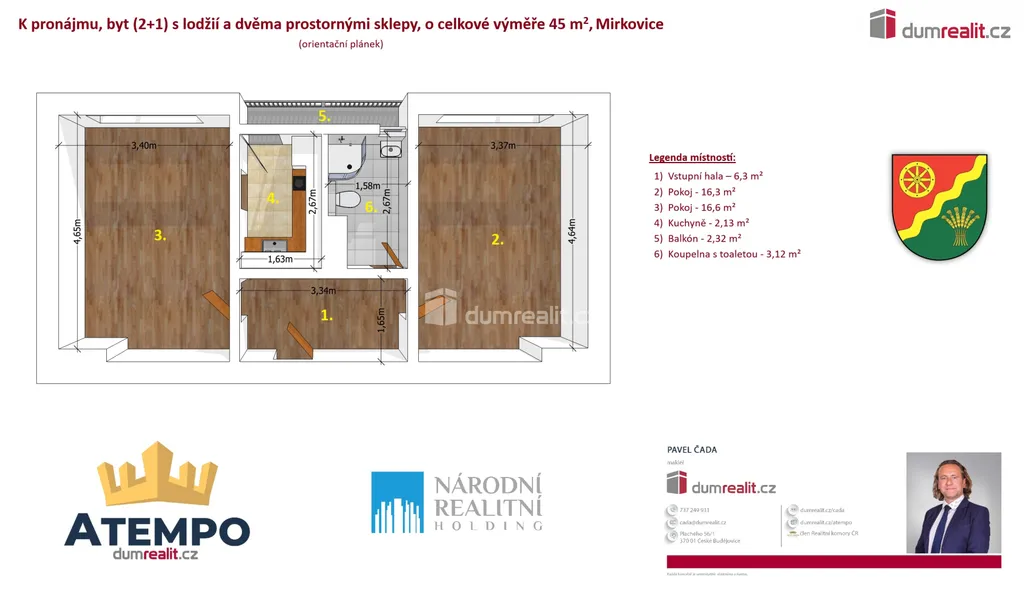 Dumrealit.cz Vám zprostředkuje pronájem světlého prostorného bytu 2+1 (45 m²) s lodžií po celkové rekonstrukci a s dvěma sklepy v obci Mirkovice. Bytový dům se nachází na strategickém místě s dojezdem 10-15 minut do Českého Krumlova, Kaplice nebo Velešína. Byt je situován na západní stranu v klidném místě obce Mirkovice. Podrobné rozkreslení dispozice bytu naleznete na orientačním plánku mezi fotografiemi. Nájemné činí 15.000,- Kč + zálohové platby na energie 3.800,- Kč měsíčně (el. energie, plyn, voda a topení). Doporučuji osobní prohlídku. Více informací Vám poskytne realitní makléř Pavel Čada z RK A TEMPO fungující pod ochranou známkou dumrealit.cz. Ev. číslo: 654762.