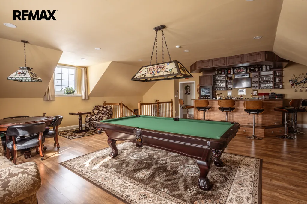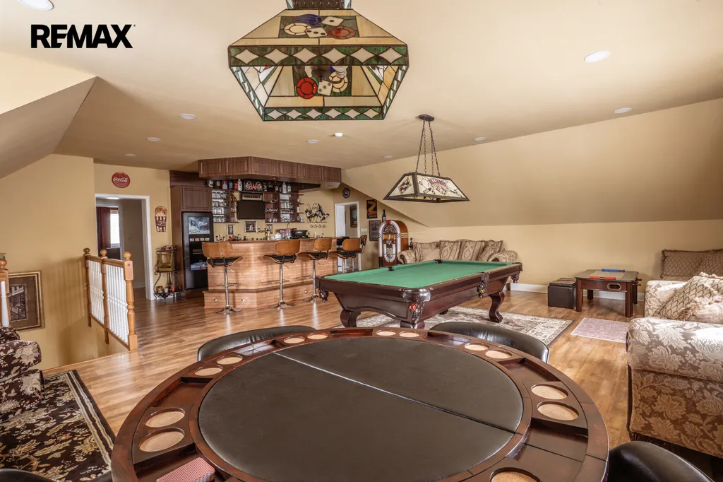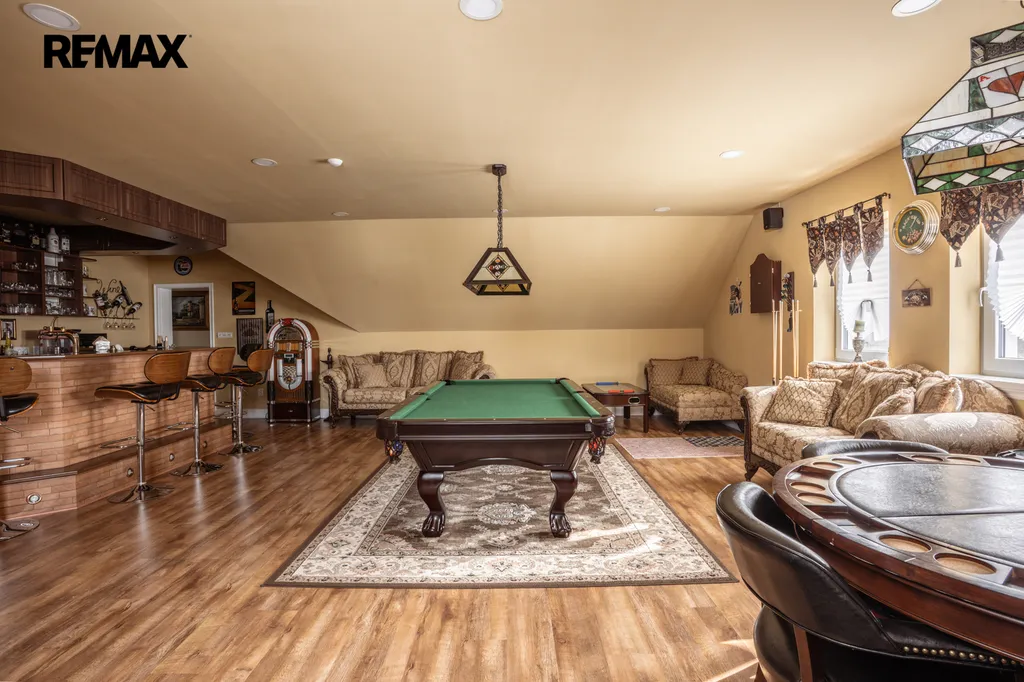 Unikátní hodnotou této nemovitosti je kompletní zázemí pro volný čas i práci z domova v patře domu. Nachází se zde samostatná pánská herna vybavená dokonale zařízeným barem ... kulečníkem , pokerovým stolem, stolním fotbálkem i šachovým stolem.