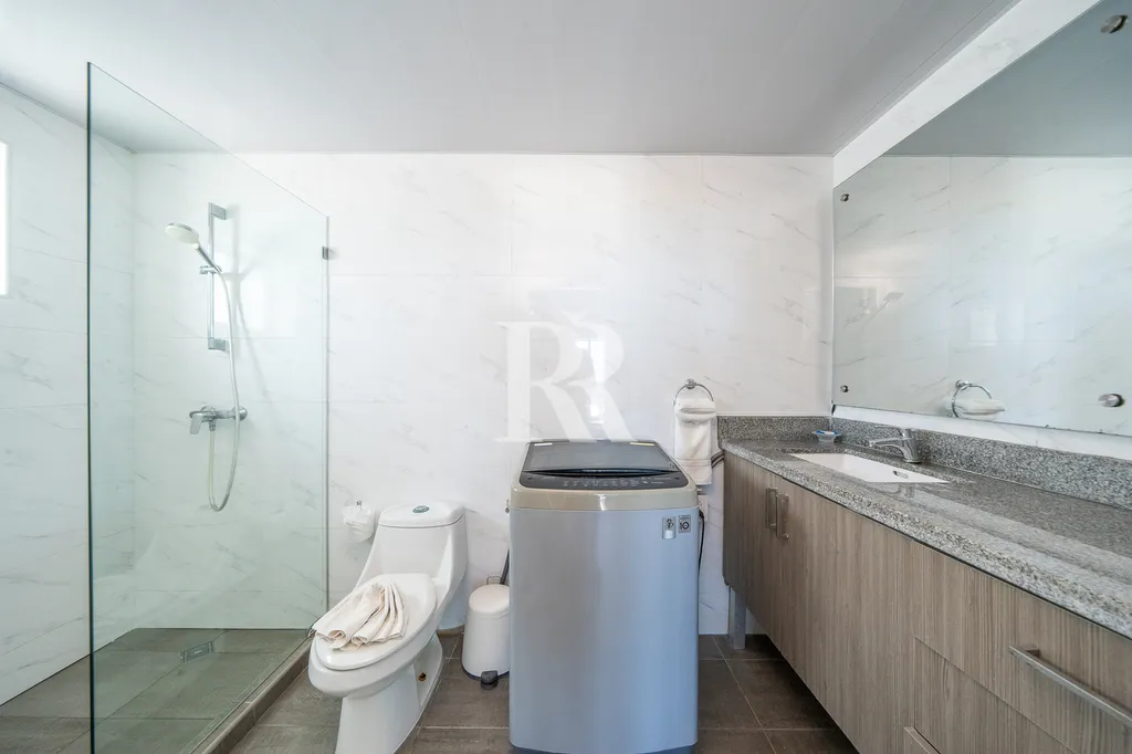 Vnitřní dispozice nabízí 2 samostatné ložnice - obě s výhledem na oceán, 2 koupelny, prostorný obývací pokoj s kuchyňským koutem a terasu.