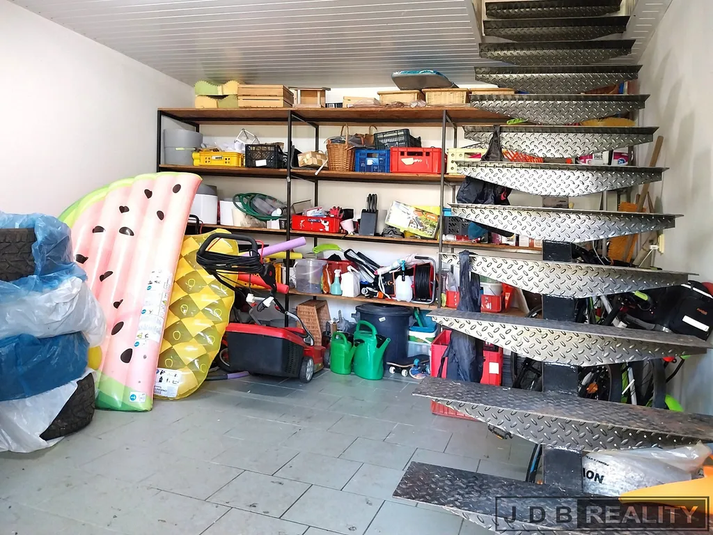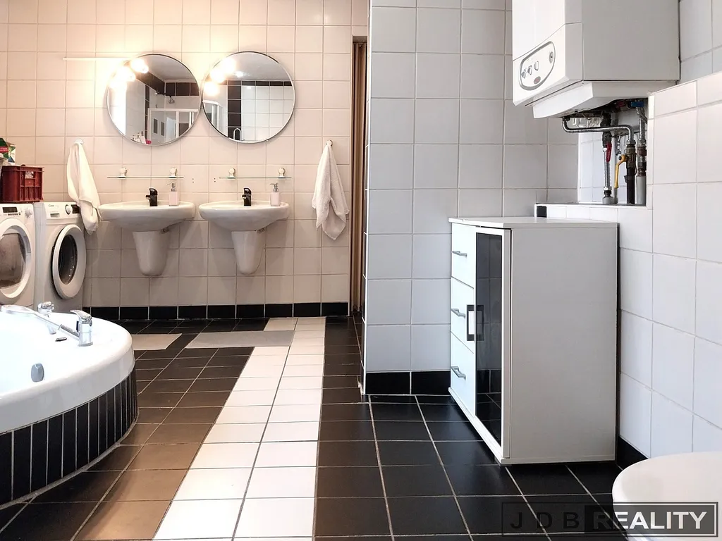 V domě nalezneme také velkou koupelnu se sprchovým koutem a vanou, dvěma umyvadly a wc. Druhé samostatné wc se nachází v patře vedle pokojů. Součástí podkroví je také velký ochoz, který je využíván k odpočinku, případně pro domácí sportovní aktivity. Celý dům disponuje velkým množstvím úložných prostor a vzhledem ke svému uspořádání a velkým francouzským oknům, je celý dům krásně prosvětlen.