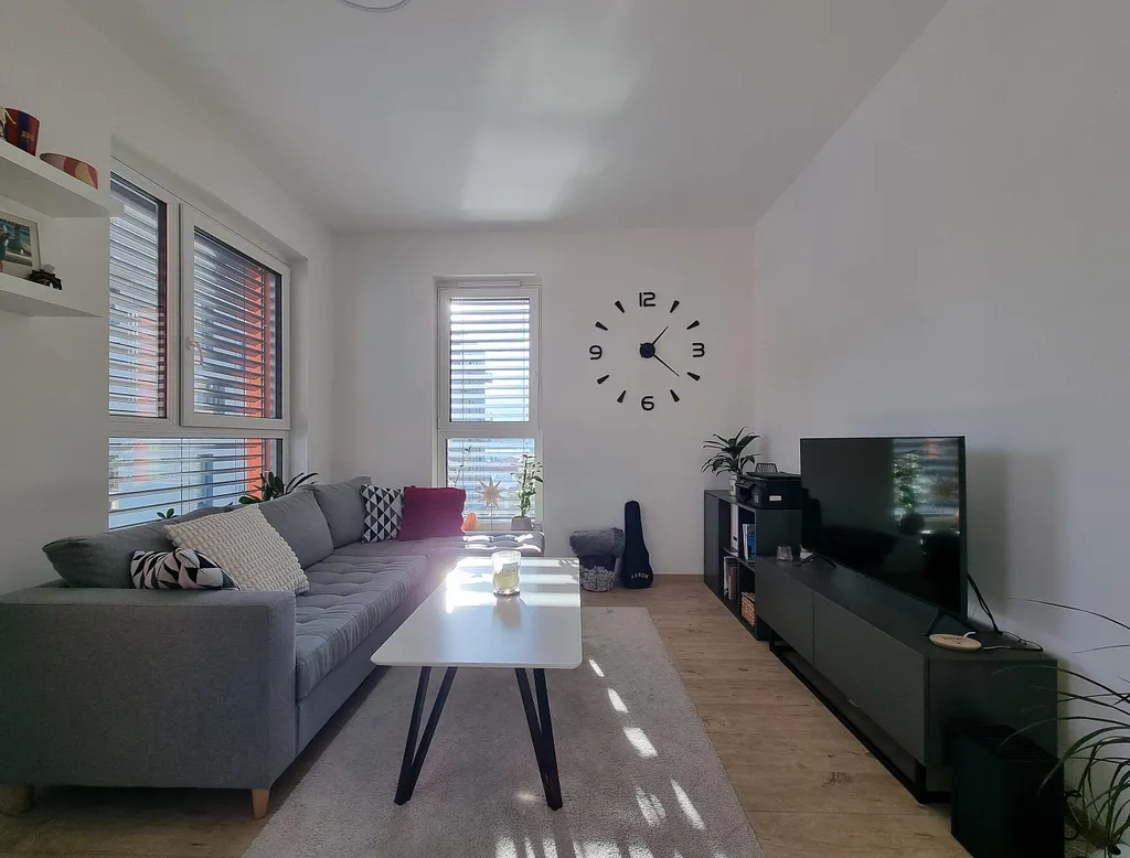 Dispozice bytu: obývací pokoj s částečně odděleným kuchyňským koutem (27 m²) - čtyři velká okna včetně balkonu (4 m²), neprůchozí ložnice (13 m²), koupelna se zděným sprchovým koutem a skleněnou zástěnou; malé okno, koupelnový nábytek, zrcadlo, přípojka na pračku 600 mm (velikost 5 m²) - podlahové vytápění, samostatné WC + umývátko, prostorná vstupní hala - předsíň (9 m²) - součástí vestavěné skříně a věšáková stěna. Součástí je prakticky řešená rohová kuchyňská linka v moderním bílo-šedém designu - vybavena indukční sklokeramickou varnou deskou, elektrickou horkovzdušnou troubou, digestoří, myčkou - vyšší standard, max. úložný systém. Venkovní - zatemňovací rolety ve všech oknech na dálkové ovládání, vkusné stropní osvětlení - dálkový ovladač, jednotný světlý odstín podlah v designu dřevo, kvalitní plastová okna (protihluk), dva výtahy v domě, dálkové vytápění. Nechybí ani bezpečná a velká sklepní kóje v suterénu domu. Slunná orientace bytu na jihozápad - vyšší podlaží je naprostou výhodou městského bydlení.