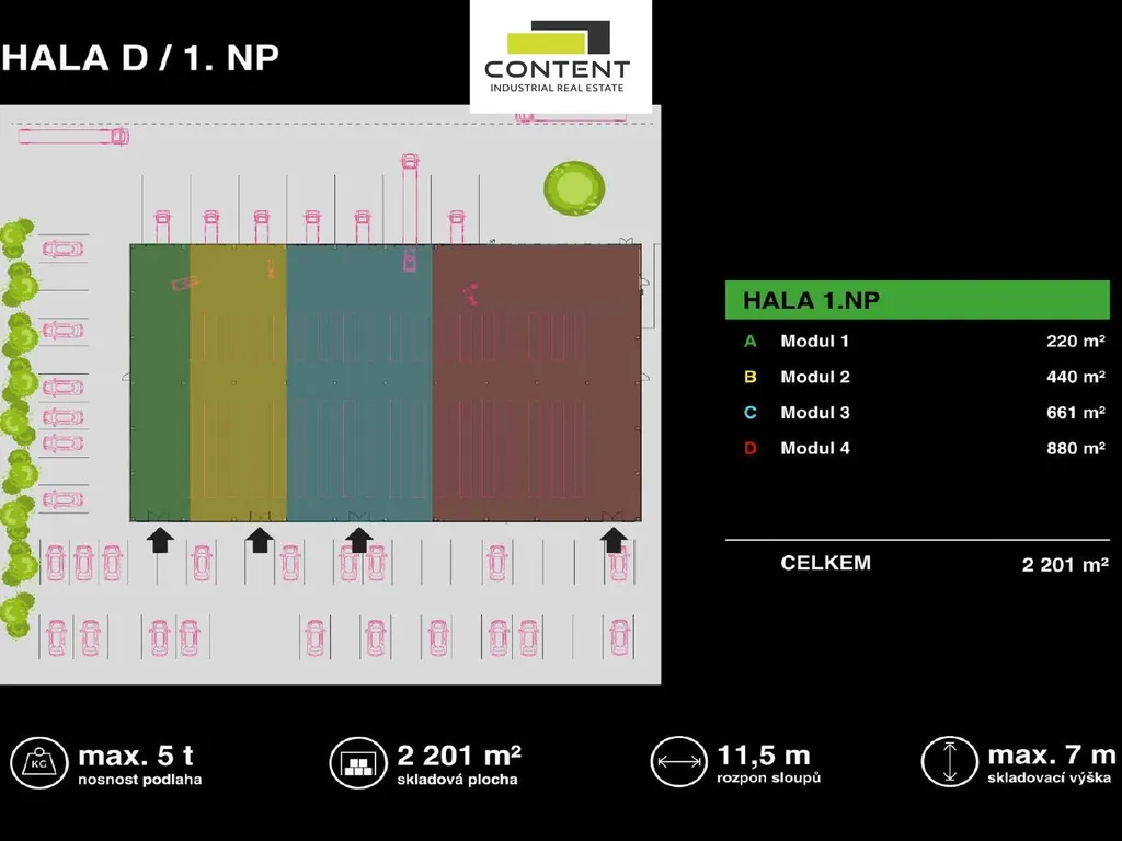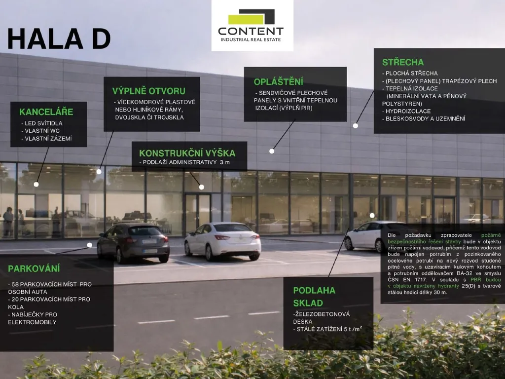 - Hala D: 2200 m² + kanceláře