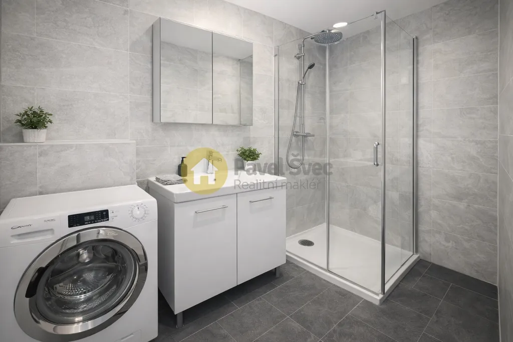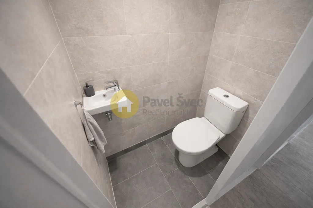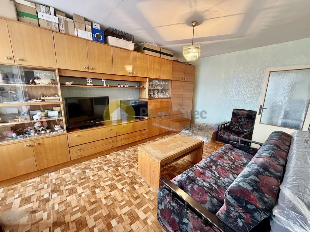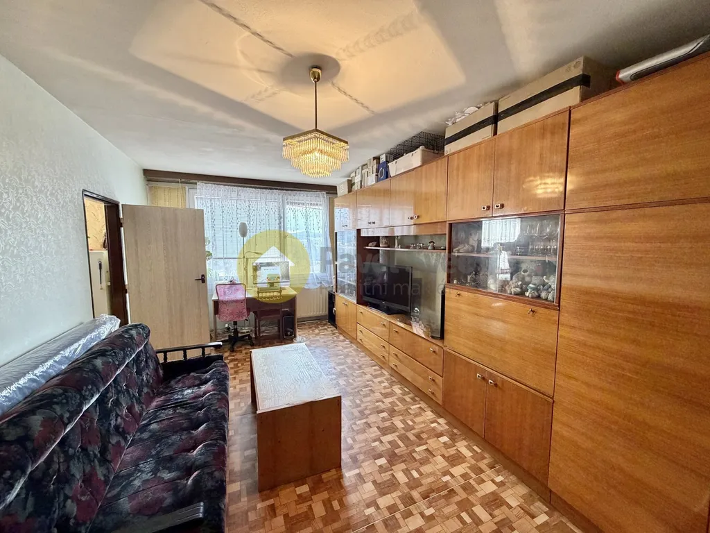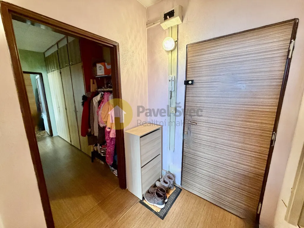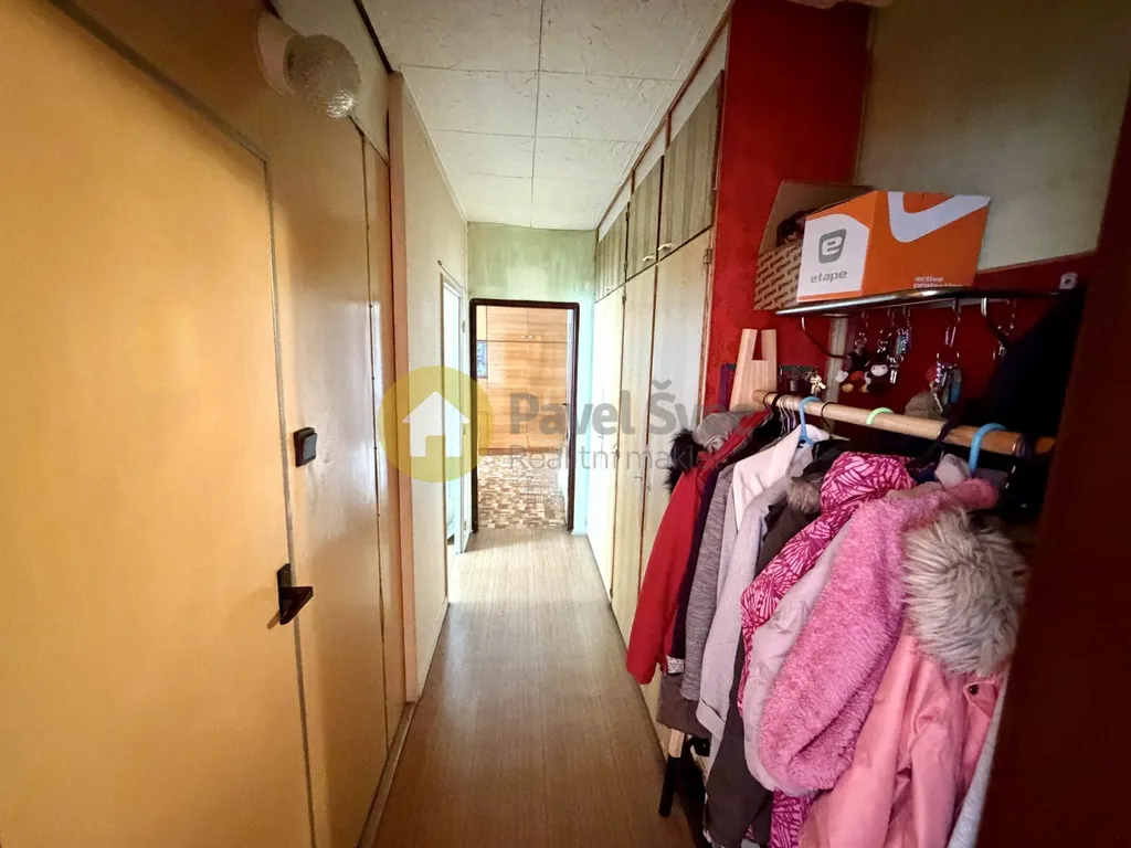 Prostorný byt (v chodbě a předsíni ideálně vestavné skříně) s praktickým řešením dispozice - do ložnice vstup z chodby bytu a do většího pokoje (obývací) jsou dokonce vstupy dva - z chodby a z kuchyně.