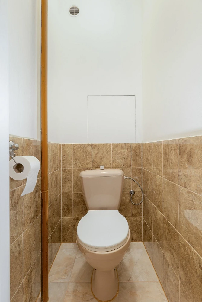 Útulnost bytu dotváří v hnědých tónech laděná koupelna s vanou, umyvadlovou skříňkou a ve stejných tónech řešená samostatná toaleta.