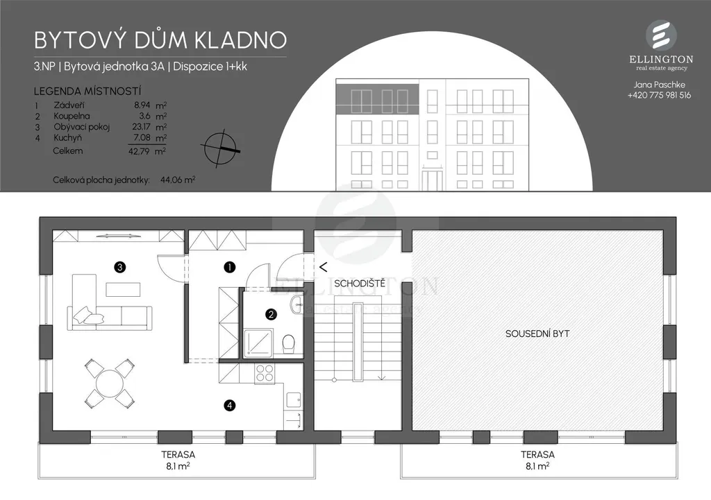 Tímto bychom vám chtěli nabídnout byt 2+kk o celkové rozloze 44m2 + 8,1m 2 terasa, který je součástí 6-ti bytů v rezidenčním projektu and #34;U zámku and #34; v Zádušní ul. Kladno, který se nachází přímo v centru Kladna, v klidné části mimo hlavní silnici.