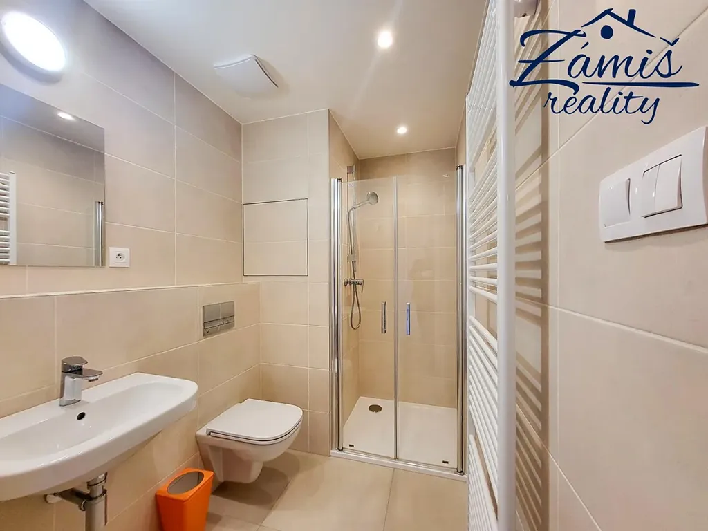 V koupelně je umístěn skleněný sprchový kout, umyvadlo se zrcadlem a WC.