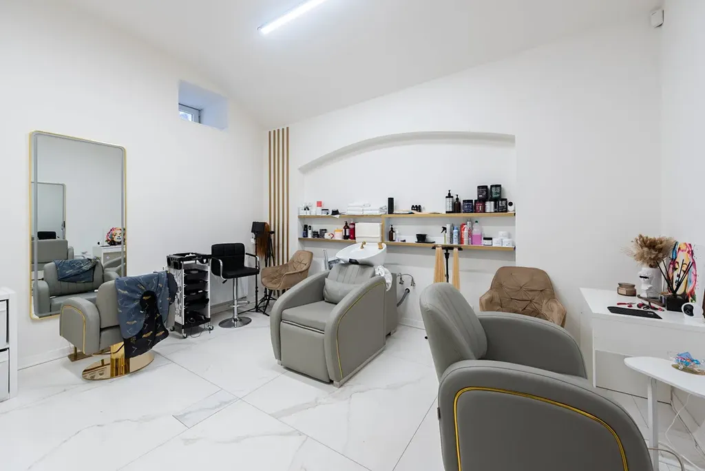 Interiér prošel velmi kvalitní úpravou a působí moderním, čistým a profesionálním dojmem. Aktuálně je prostor využíván jako beauty salon a kadeřnictví, čemuž odpovídá i dispozice – několik samostatných místností pro péči o klienty, otevřenější části s kadeřnickými křesly, zázemí pro personál, kuchyňka, technická místnost i vlastní sociální zařízení. Vše je řešeno s důrazem na detail, estetiku i praktičnost. Světlé podlahy, jemné barevné tóny, dostatek úložných prostor a promyšlené rozdělení jednotlivých částí vytvářejí příjemné prostředí jak pro klienty, tak pro personál.