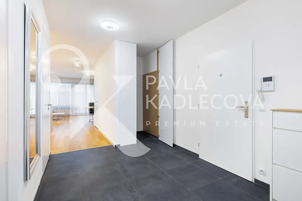 Po vstupu vás přivítá velkorysá vstupní chodba se šatnou a botníkem. Hlavní obytný prostor tvoří světlý obývací pokoj propojený s plně vybavenou kuchyní včetně všech elektrospotřebičů. Z obývací části je přímý vstup na zastřešený balkon, ideální pro relaxaci po náročném dni. Díky prostornému řešení je zde místo pro velkou rozkládací sedací soupravu i jídelní část.
