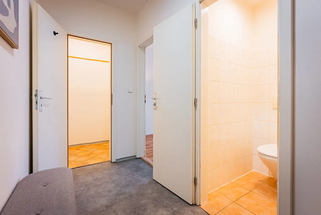 Nabízíme Vám ke koupi byt 2kk (44 m2), s lodžií (5 m2), komorou (2,3 m2) sloužící jako sklep a parkovacím stáním přímo před okny bytu. Byt je umístěn v bytovém domě z roku 2009 v obci Klecany. Velkou výhodou jsou praktické dispozice bytu. Obývací pokoj se vstupem na lodžii bytu je propojený s kuchyní. Ta je vybavena kuchyňskou linkou se základními spotřebiči. Ložnice bytu je samostatná. Příjemná je úložná šatna. Koupelna s vanou a toaleta je oddělená. Zmiňovaná komora bytu, sloužící jako sklep, je na stejném patře. Lodžie je chráněná mříží a celý byt má předokenní žaluzie. Na auto zaparkované na příslušném parkovacím místě je pohodlně vidět z bytu.