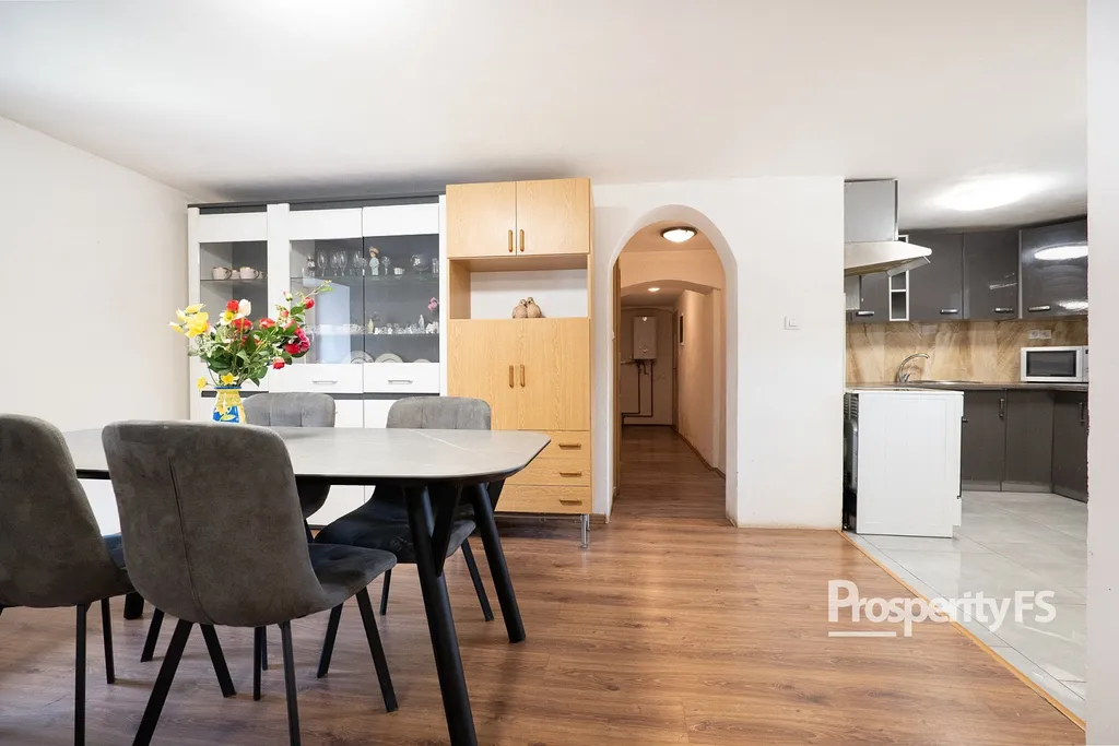Druhá bytová jednotka je řešena modernějším způsobem – s obývacím prostorem propojeným s kuchyňským koutem, což působí vzdušně a útulně. K tomu dva samostatné pokoje, které mohou sloužit jako ložnice, dětský pokoj či pracovna. Díky své dispozici je tento byt vhodný nejen pro prarodiče, ale také pro mladý pár nebo jako investiční pronájem.