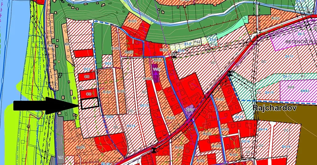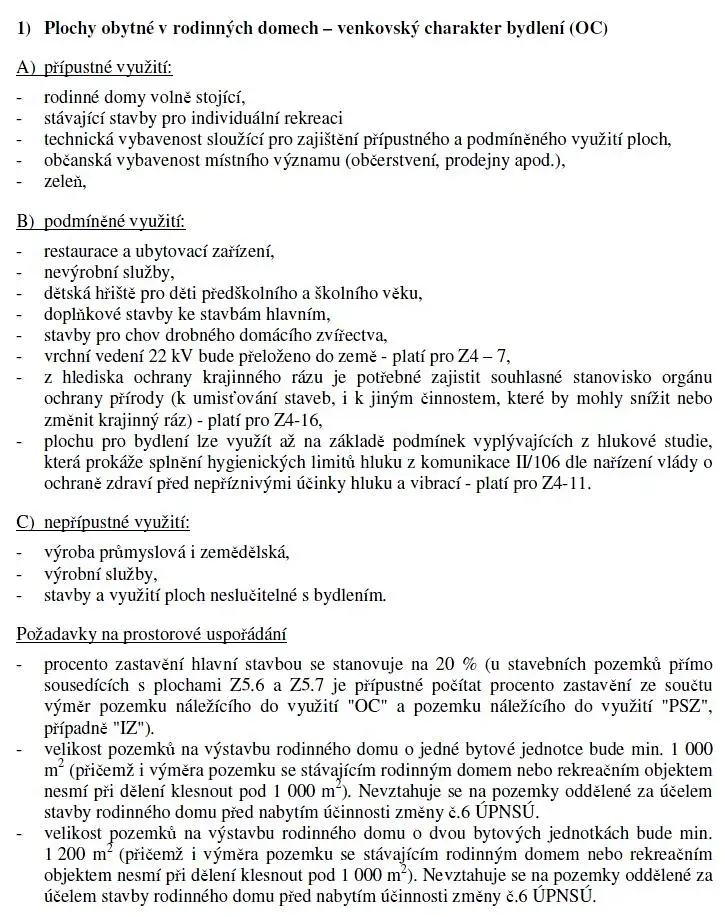 Dle územního plánu se pozemek nalézá v území OC – plochy obytné v rodinných domech – venkovský charakter bydlení. Požadavky prostorového uspořádání – maximální procento zastavění hlavní stavbou 20%, minimální velikost pozemku na stavbu RD až o 3 bytových jednotkách 1.600 m2. Ve fotogalerii je pro inspiraci i koordinační situace na stavbu novostavby RD předchozích majitelů.