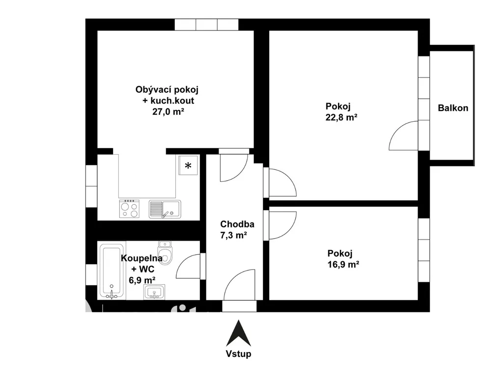 Dispozice je řešena jako 3+kk, nachází se v 1. podlaží, pokoje jsou neprůchozí, takže každý člen domácnosti má své soukromí. Jako příjemný bonus je tu balkon.